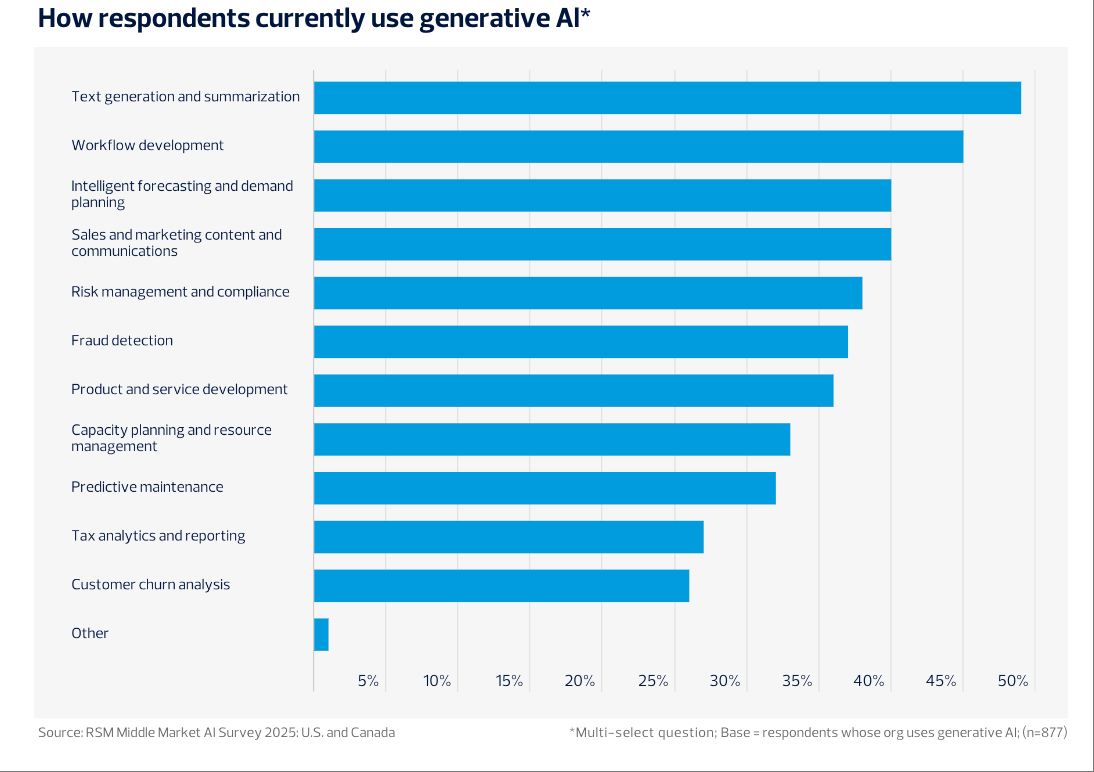 这较2024年的77%全面提拔,42%开展手艺研讨或认证课程,53%认为本身只“部门预备好”,37%的企业已明白制定AI计谋线%也处于晚期规划阶段。企业遍及认为AI实施风险和政策度高于美国。AI将正在三年内沉塑中端市场营业流程和办理架构,取2024年对比,2025年,RSM的调研成果显示,市场份额分化较着。凸显生成式AI正在中端市场的敏捷普及取支流地位。生成式AI使用正在市场、财政、供应链等范畴的占比别离提拔9%、7%、6%,请隆重辨别!支流企业AI渗入率近六成2025年7月美国消费者财政健康走弱,2025年全球办公人员AI使用:日活跃用户出产力提拔光鲜明显,45%节流了数据阐发时间,28%存正在合规风险,AI将成为驱动中型企业数字化转型和持久合作力提拔的焦点动力。申明中型企业借帮AI进一步提拔流程效率和响应速度。只要1%的企业明白暗示短期无相关打算。79%的中型企业已制定或正制定AI计谋;43%制定专属AI伦理法则。正在风险合规、产物研发和资本办理范畴的使用比例也别离达到38%、36%和33%。88%则打算将来一年继续添加预算投入。鞭策决策前移和立异冲破。数据表白,美国取中型企业的人工智能使用进入高速成长阶段。代办署理型AI正正在崭露头角。